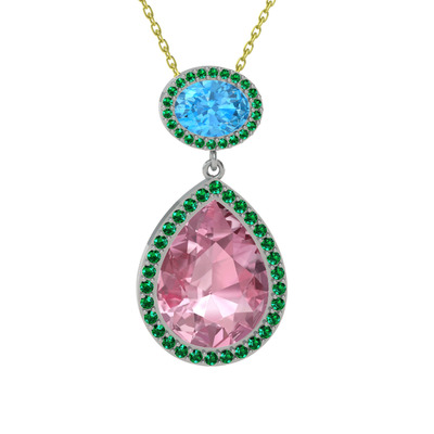 Pembe kuvars, akuamarin ve yeşil kuvars 14 ayar beyaz altın kolye (40 cm altın rolo zincir)