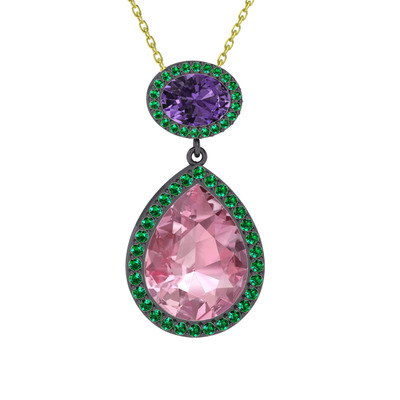 Pembe kuvars, ametist ve yeşil kuvars 925 ayar siyah rodyum kaplama gümüş kolye (40 cm gümüş rolo zincir)