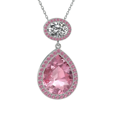 Pembe kuvars ve beyaz zirkon 18 ayar beyaz altın kolye (40 cm gümüş rolo zincir)