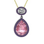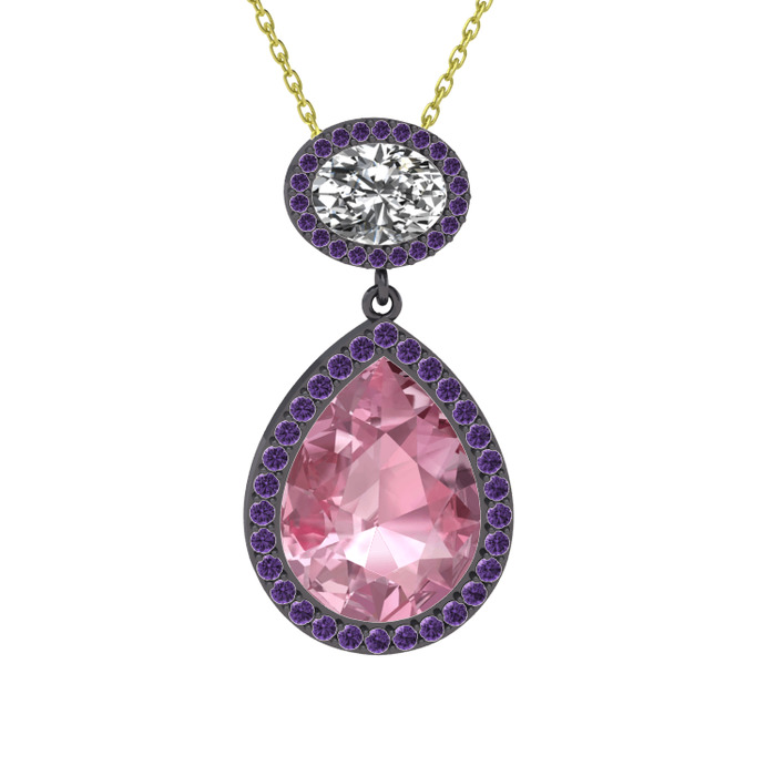 Pembe kuvars, beyaz zirkon ve ametist 925 ayar siyah rodyum kaplama gümüş kolye (40 cm altın rolo zincir)