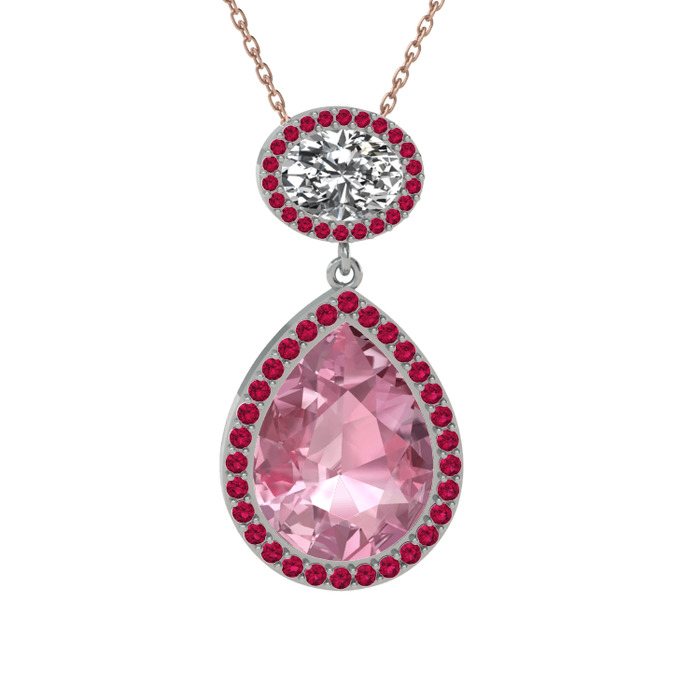 Pembe kuvars, beyaz zirkon ve rodolit garnet 18 ayar beyaz altın kolye (40 cm rose altın rolo zincir)