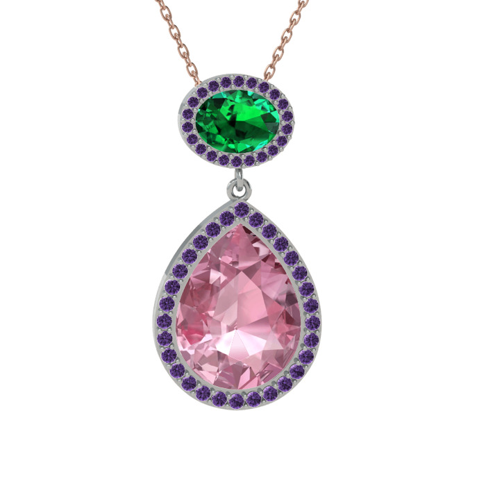 Pembe kuvars, yeşil kuvars ve ametist 925 ayar gümüş kolye (40 cm rose altın rolo zincir)