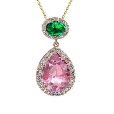 Pembe kuvars, yeşil kuvars ve beyaz zirkon 8 ayar rose altın kolye (40 cm altın rolo zincir)