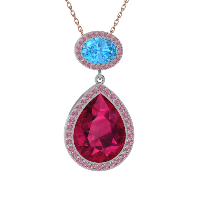 Rodolit garnet, akuamarin ve pembe kuvars 925 ayar gümüş kolye (40 cm rose altın rolo zincir)