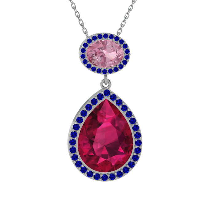 Rodolit garnet, pembe kuvars ve lab safir 18 ayar beyaz altın kolye (40 cm beyaz altın rolo zincir)