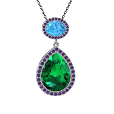 Yeşil kuvars, akuamarin ve ametist 18 ayar beyaz altın kolye (40 cm gümüş rolo zincir)