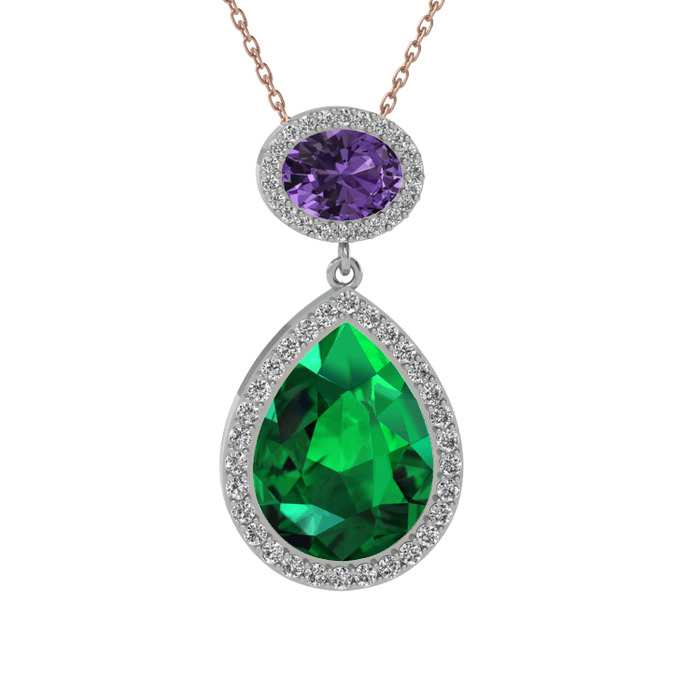 Yeşil kuvars, ametist ve beyaz zirkon 14 ayar beyaz altın kolye (40 cm rose altın rolo zincir)