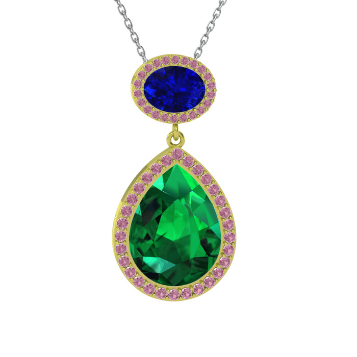 Yeşil kuvars, lab safir ve pembe kuvars 14 ayar altın kolye (40 cm gümüş rolo zincir)
