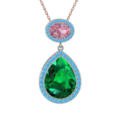 Yeşil kuvars, pembe kuvars ve akuamarin 18 ayar beyaz altın kolye (40 cm rose altın rolo zincir)
