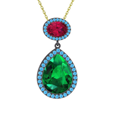 Yeşil kuvars, rodolit garnet ve akuamarin 925 ayar siyah rodyum kaplama gümüş kolye (40 cm altın rolo zincir)