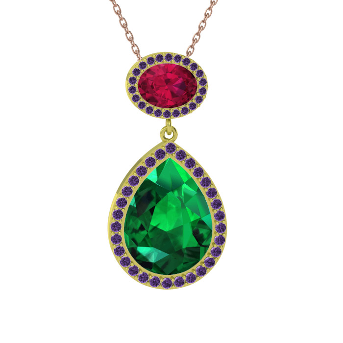 Yeşil kuvars, rodolit garnet ve ametist 14 ayar altın kolye (40 cm gümüş rolo zincir)