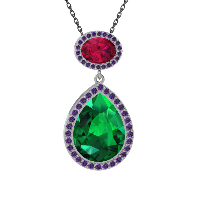 Yeşil kuvars, rodolit garnet ve ametist 8 ayar beyaz altın kolye (40 cm gümüş rolo zincir)