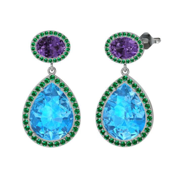 Akuamarin, ametist ve yeşil kuvars 8 ayar beyaz altın küpe