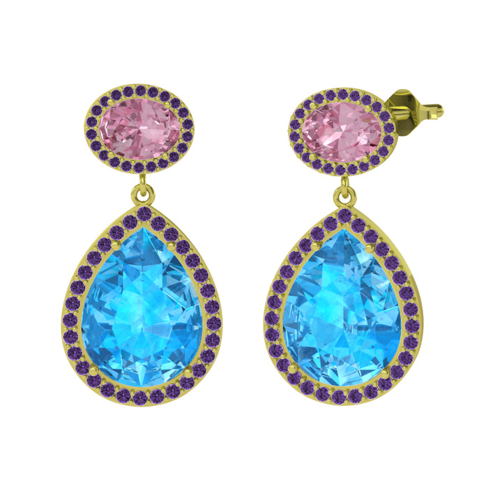Akuamarin, pembe kuvars ve ametist 8 ayar altın küpe