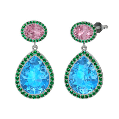 Akuamarin, pembe kuvars ve yeşil kuvars 18 ayar beyaz altın küpe