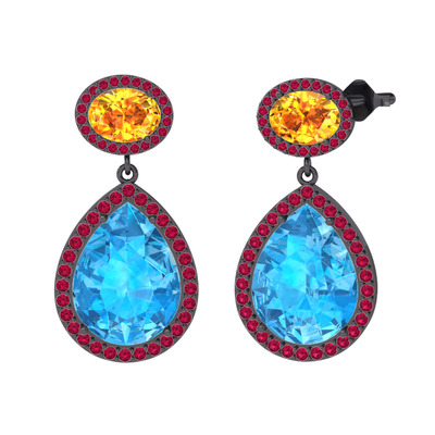 Akuamarin, sitrin ve rodolit garnet 925 ayar siyah rodyum kaplama gümüş küpe