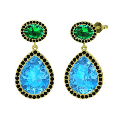 Akuamarin, yeşil kuvars ve siyah zirkon 8 ayar altın küpe