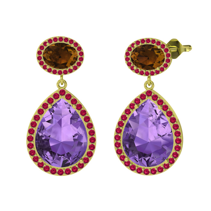 Ametist, dumanlı kuvars ve rodolit garnet 8 ayar altın küpe