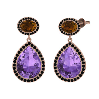 Ametist, dumanlı kuvars ve siyah zirkon 925 ayar rose altın kaplama gümüş küpe