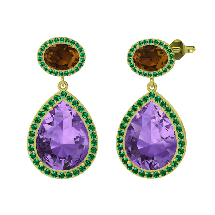 Ametist, dumanlı kuvars ve yeşil kuvars 8 ayar altın küpe