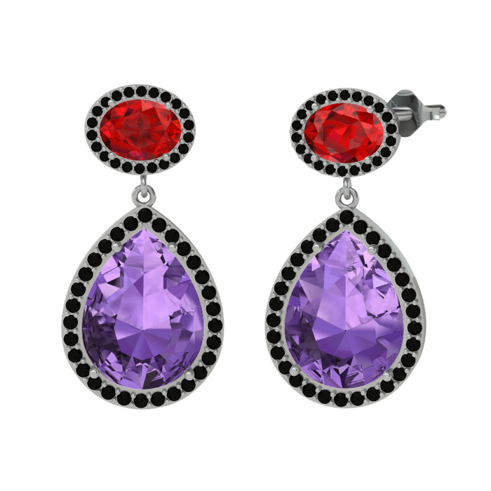 Ametist, garnet ve siyah zirkon 8 ayar beyaz altın küpe
