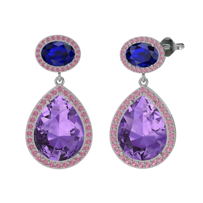 Ametist, lab safir ve pembe kuvars 18 ayar beyaz altın küpe