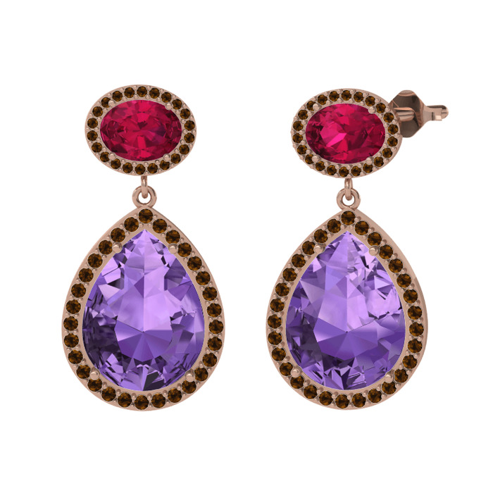 Ametist, rodolit garnet ve dumanlı kuvars 925 ayar rose altın kaplama gümüş küpe