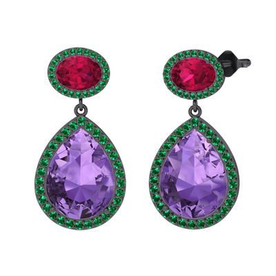 Ametist, rodolit garnet ve yeşil kuvars 925 ayar siyah rodyum kaplama gümüş küpe