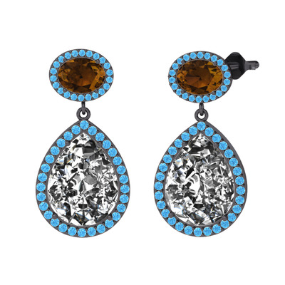 Beyaz zirkon, dumanlı kuvars ve akuamarin 925 ayar siyah rodyum kaplama gümüş küpe