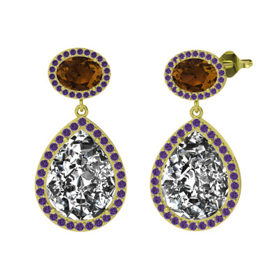 Beyaz zirkon, dumanlı kuvars ve ametist 14 ayar altın küpe