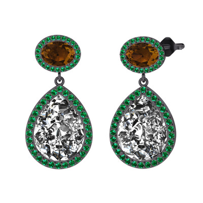 Beyaz zirkon, dumanlı kuvars ve yeşil kuvars 925 ayar siyah rodyum kaplama gümüş küpe