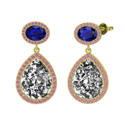 Beyaz zirkon, lab safir ve pembe kuvars 8 ayar altın küpe