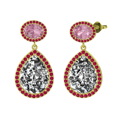 Beyaz zirkon, pembe kuvars ve rodolit garnet 8 ayar altın küpe