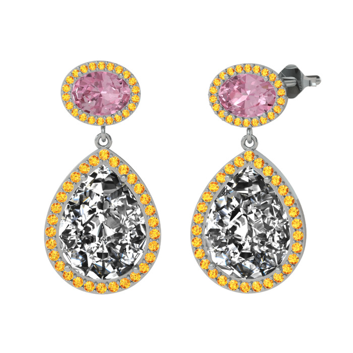 Beyaz zirkon, pembe kuvars ve sitrin 8 ayar beyaz altın küpe