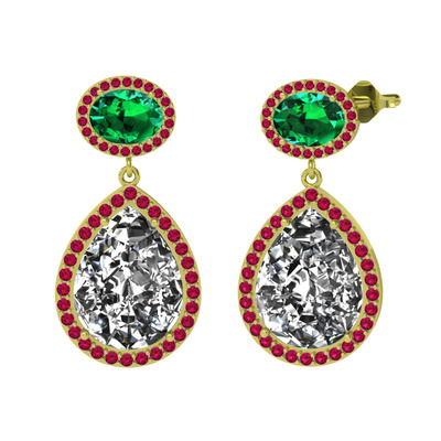 Beyaz zirkon, yeşil kuvars ve rodolit garnet 14 ayar altın küpe
