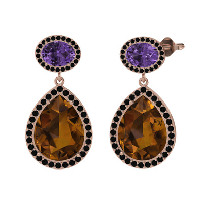 Dumanlı kuvars, ametist ve siyah zirkon 14 ayar rose altın küpe