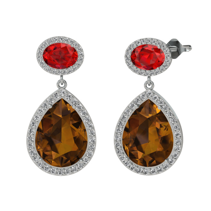 Dumanlı kuvars, garnet ve beyaz zirkon 14 ayar beyaz altın küpe