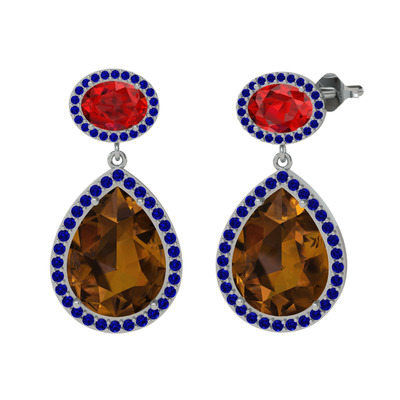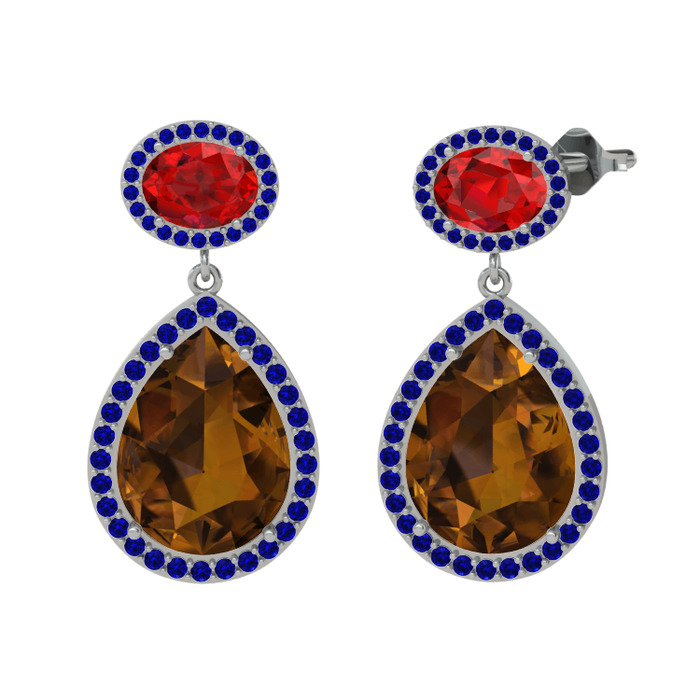 Dumanlı kuvars, garnet ve lab safir 14 ayar beyaz altın küpe