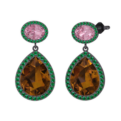 Dumanlı kuvars, pembe kuvars ve yeşil kuvars 925 ayar siyah rodyum kaplama gümüş küpe