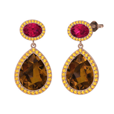 Dumanlı kuvars, rodolit garnet ve sitrin 925 ayar rose altın kaplama gümüş küpe
