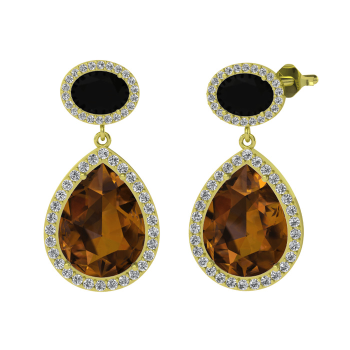 Dumanlı kuvars, siyah zirkon ve beyaz zirkon 14 ayar altın küpe