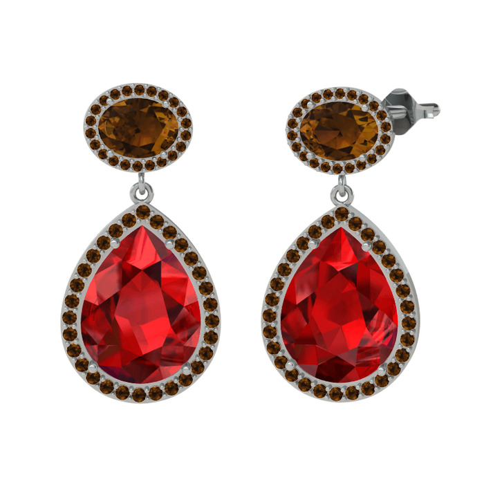 Garnet ve dumanlı kuvars 8 ayar beyaz altın küpe