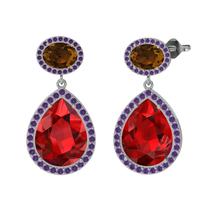 Garnet, dumanlı kuvars ve ametist 14 ayar beyaz altın küpe