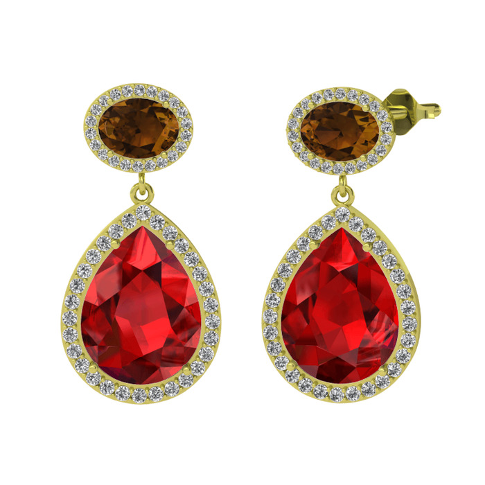 Garnet, dumanlı kuvars ve beyaz zirkon 18 ayar altın küpe