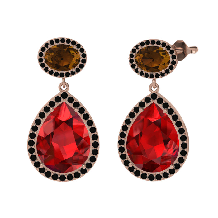 Garnet, dumanlı kuvars ve siyah zirkon 14 ayar rose altın küpe