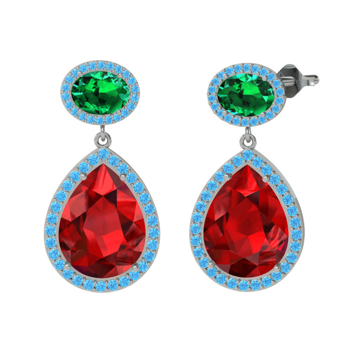 Garnet, yeşil kuvars ve akuamarin 8 ayar beyaz altın küpe