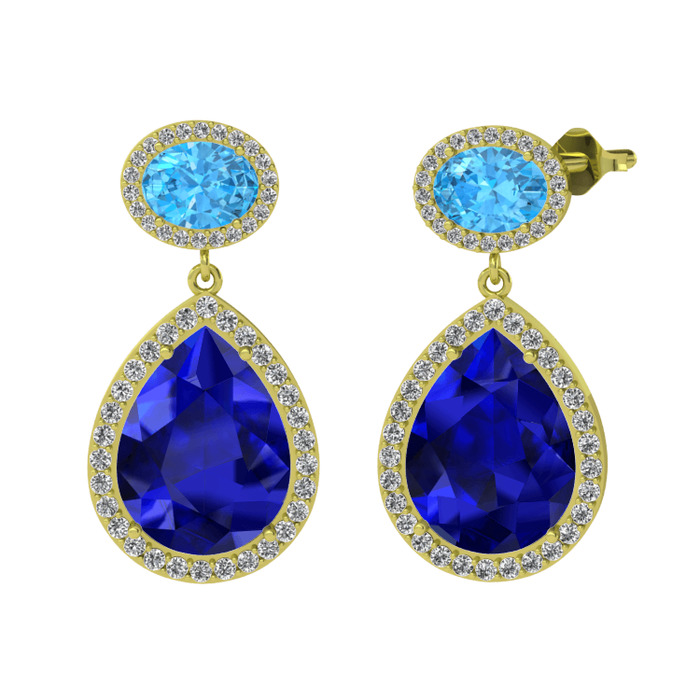 Lab safir, akuamarin ve beyaz zirkon 14 ayar altın küpe