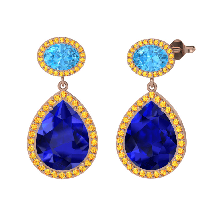 Lab safir, akuamarin ve sitrin 14 ayar rose altın küpe