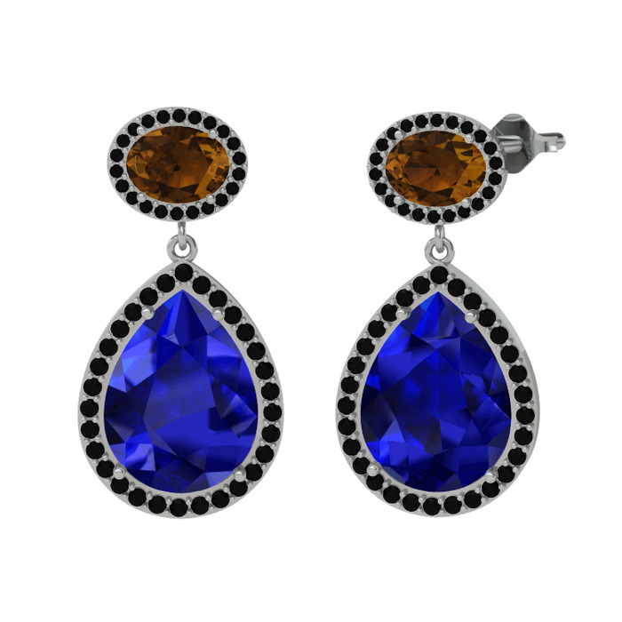 Lab safir, dumanlı kuvars ve siyah zirkon 925 ayar gümüş küpe