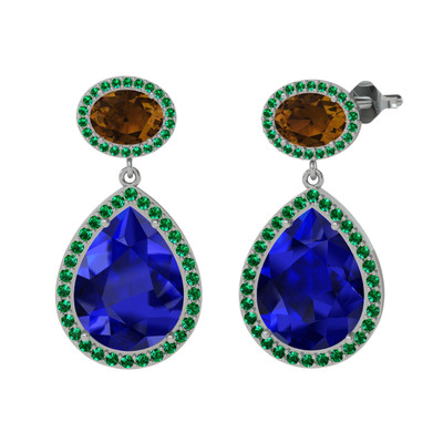 Lab safir, dumanlı kuvars ve yeşil kuvars 18 ayar beyaz altın küpe